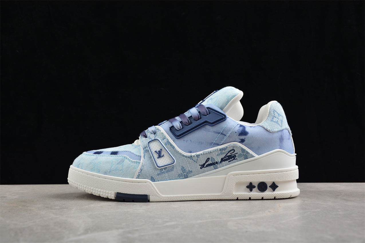 💎 The LV Trainer Blue Bleached Monogram Denim features a high-end denim upper with Louis Vuitton’s iconic monogram pattern, treated in a unique bleached blue wash for a modern vintage effect. Accented with white leather overlays, LV logo detailing, and signature stitching, it perfectly balances sophistication and edge. The multi-layer rubber sole, embossed with LV motifs, provides stability and comfort, while the 1:1 replica craftsmanship ensures authentic structure, texture, and finish — true to Louis Vuitton’s elite standards.